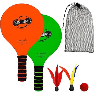 Jazzminton Paddle Ball Game Beach for Family and Friends - 2 Paddles, 2 Birdies, 1 Ball and Carry Bag – Wind Birdie Included for Windy Days