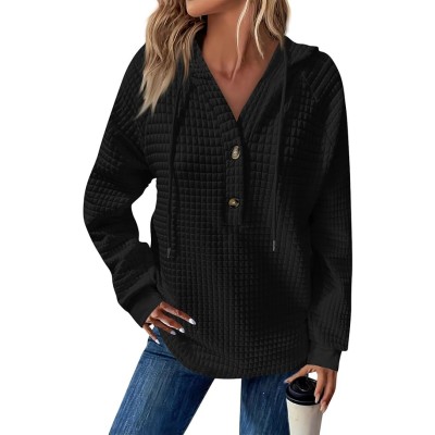 Waffle Knit Hoodie for Women Quilted Pattern Loose Fit V Neck Solid Button Drawstring Sweatshirt Pullover