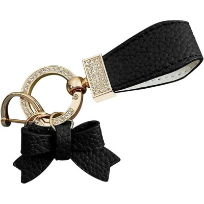 Bling Car Rhinestone Bow Leather Keychain Pendant, Alloy + PU Leather Portable Creative Cute Key Ring, Universal for Cars (Black)
